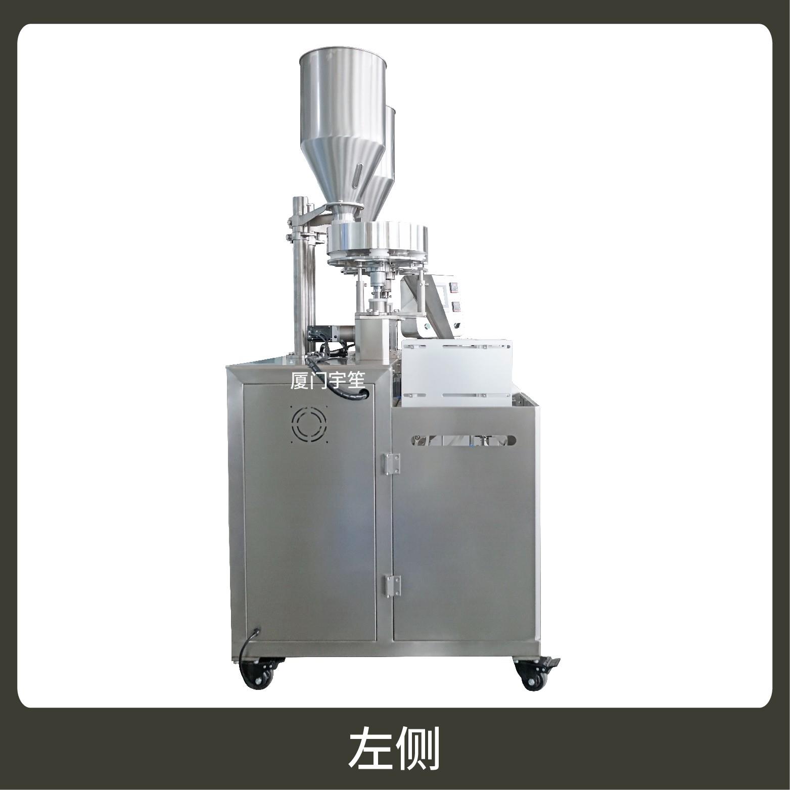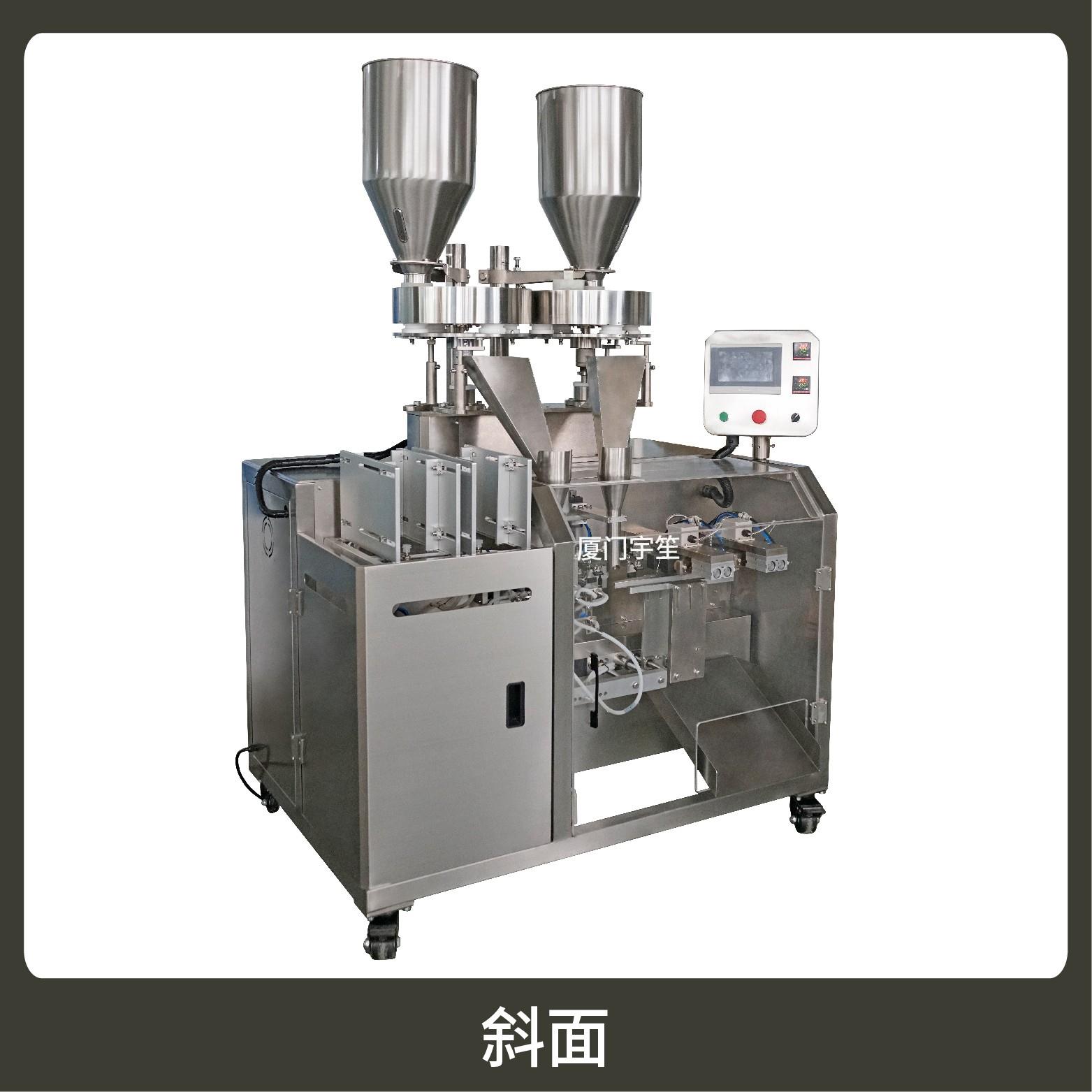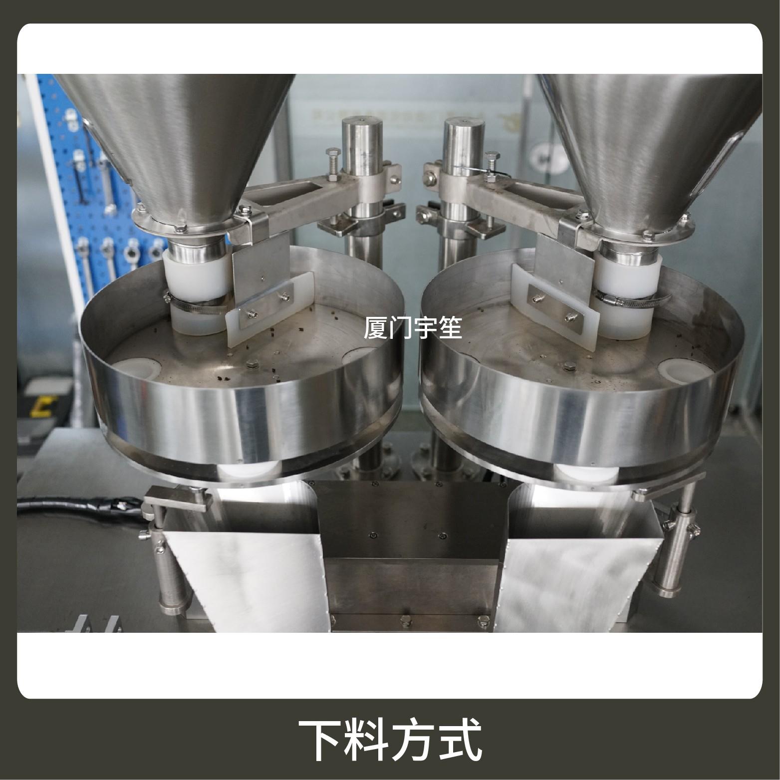 1、成品雙出,速度快,包裝流程全自動,無需人工操作??筛鶕?jù)充填物料的性質(zhì)選配不同的下料結(jié)構(gòu)。
